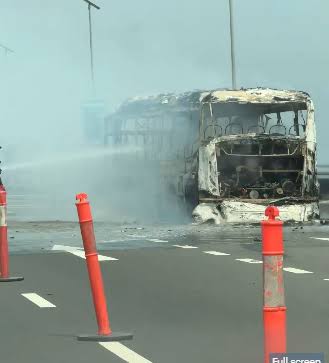 On Tuesday in Lagos State, a large bus caught fire on the Third Mainland Bridge. The fire apparently started close to the bridge's Adekunle axis while the bus was traveling towards Iyana Oworo. At the time this report was filed, it wa